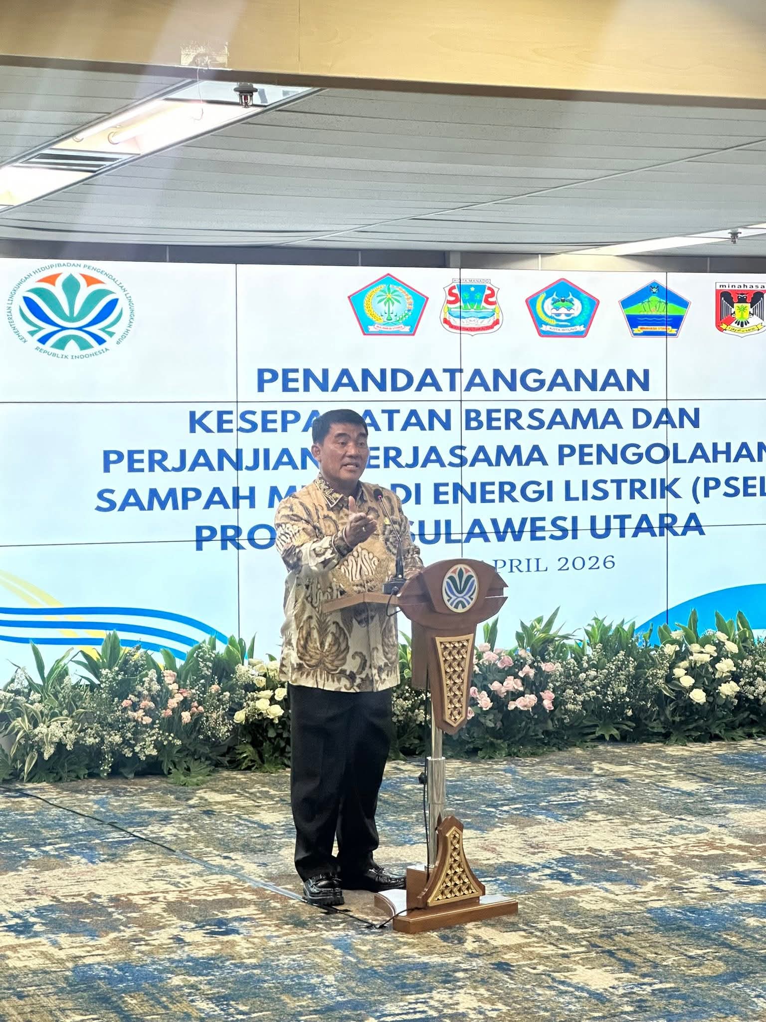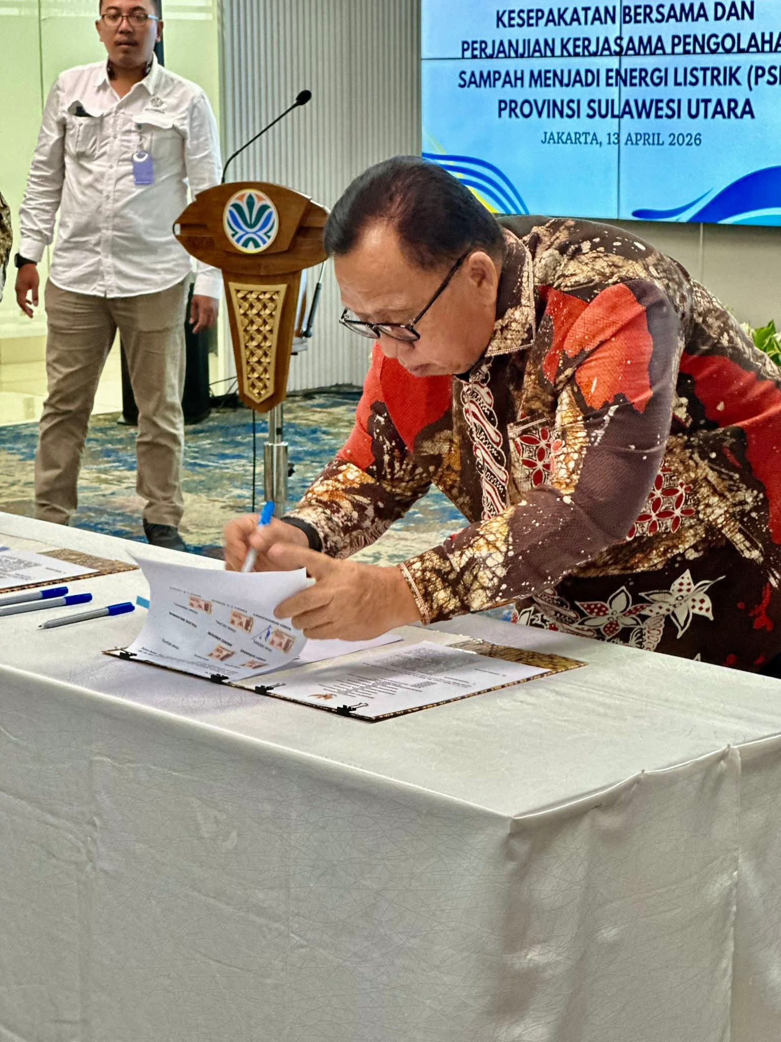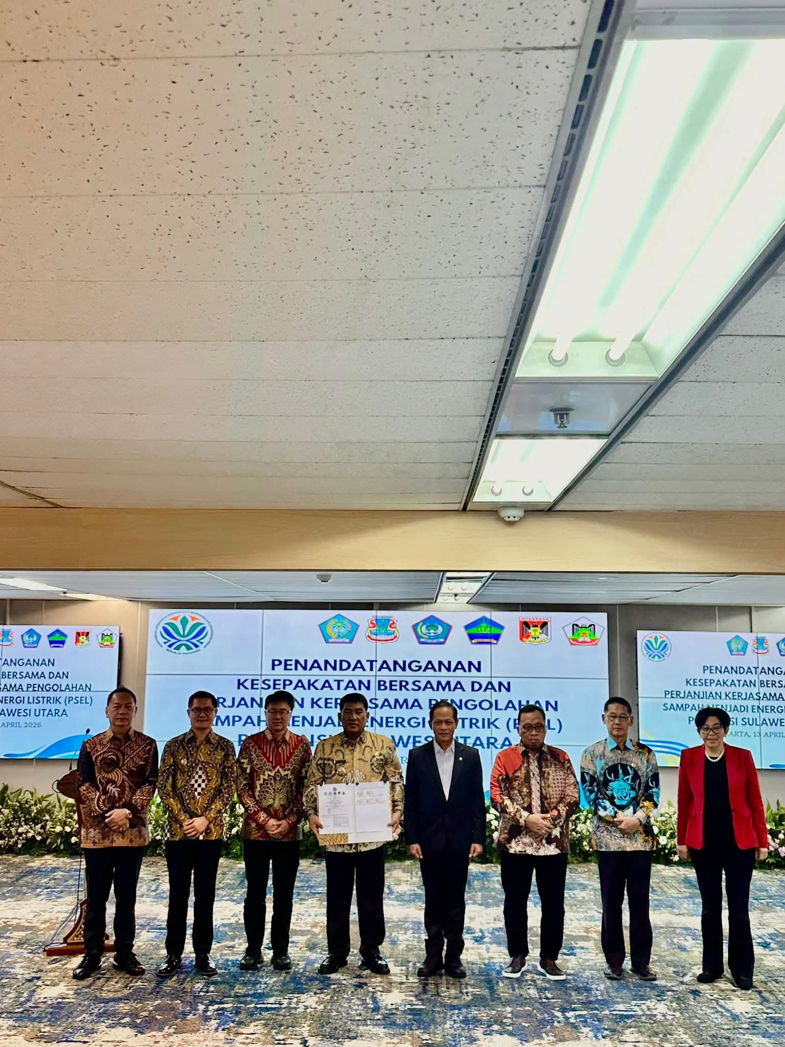 JENDELAANALISIS.COM – Bupati Minahasa Dr. Robby Dondokambey, S.Si, MAP yang didampingi oleh Ketua TP-PKK Kabupaten Minahasa Ny. Martina Watok Dondokambey-Lengkong, SE mengikuti Penandatanganan Kesepakatan Bersama dan Perjanjian Kerjasama Pengolahan Sampah Menjadi Energi Listrik (PSEL) di Provinsi Sulawesi Utara, bertempat di Gedung Plaza Kuningan. Jakarta Selatan.